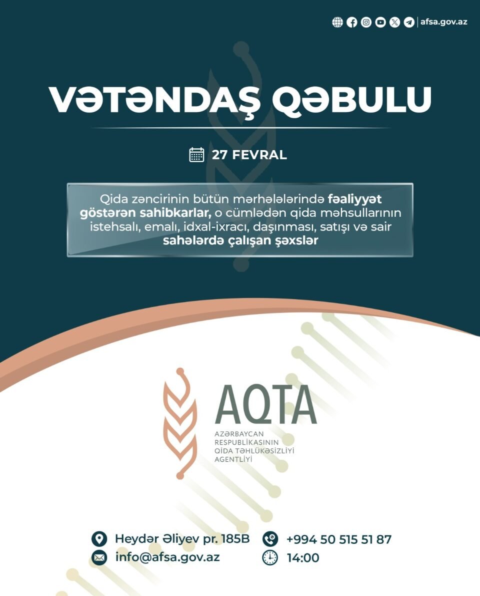 Qida zəncirinin bütün mərhələlərində fəaliyyət göstərən sahibkarlar, o cümlədən qida məhsullarının istehsalı, emalı, idxal-ixracı, daşınması, satışı və sair sahələrdə çalışan şəxslər fevralın 27-si saat 14:00-da onları narahat edən məsələlərlə bağlı Agentlik sədri ilə görüşə bilərlər.